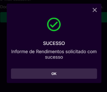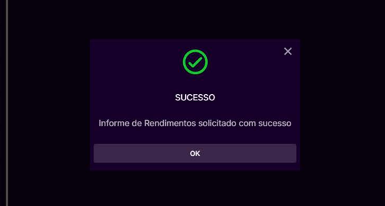 Após a confirmação, uma mensagem de sucesso irá aparecer na tela, confirmando o seu Informe de Rendimentos, que será enviado para o seu e-mail.